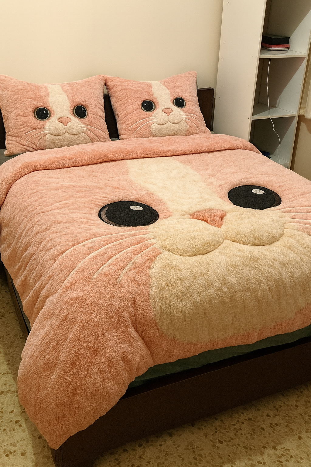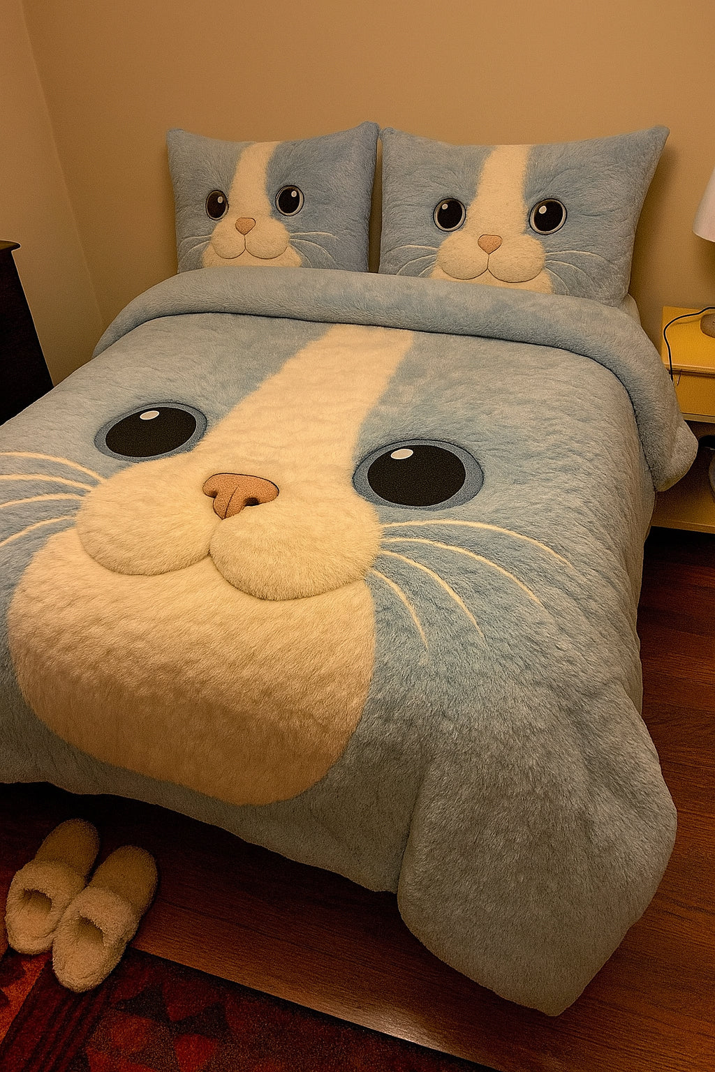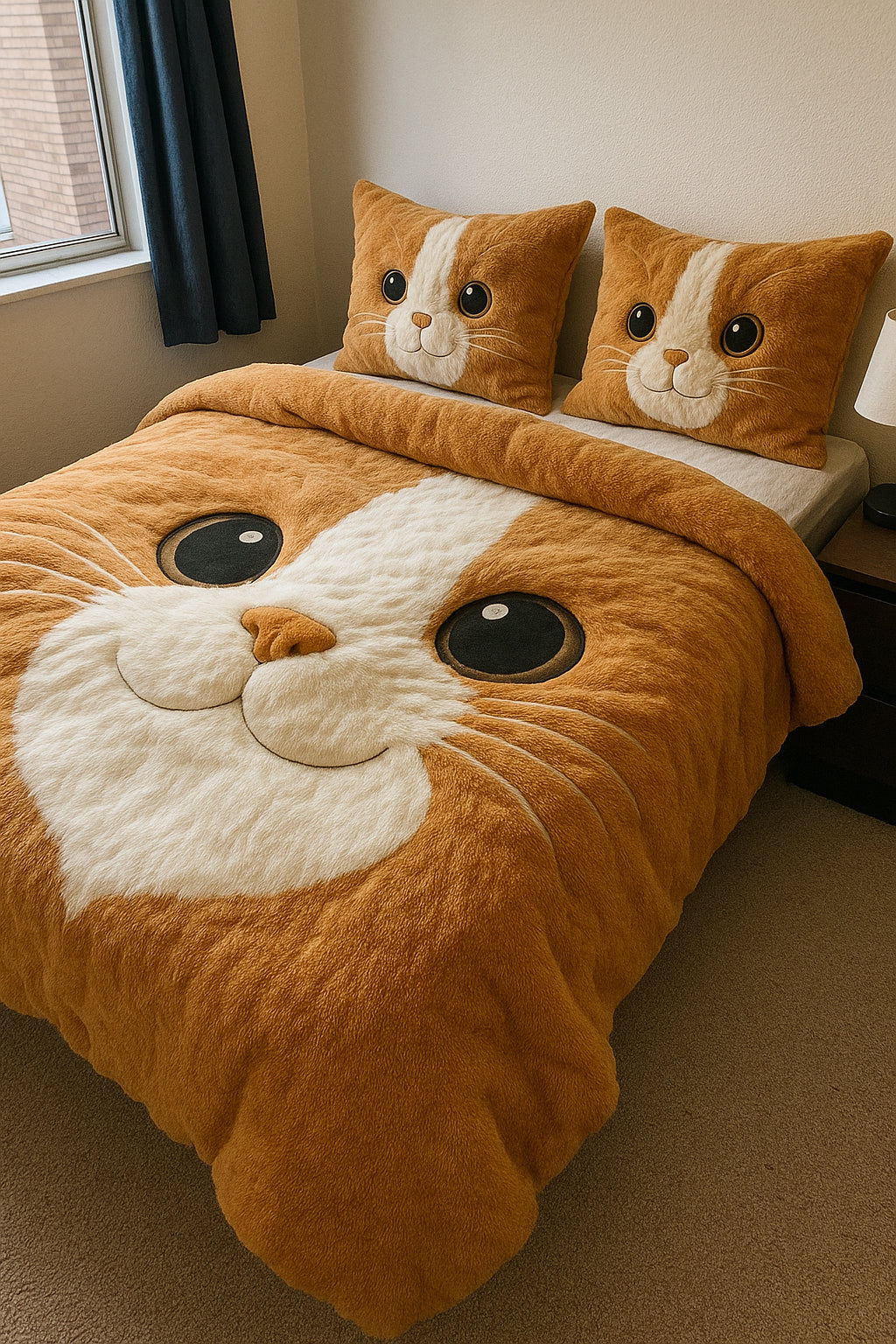 Con su enorme carita de gato súper tierna impresa en la funda y sus fundas de almohada a juego, este juego de cama transforma al instante tu habitación en un espacio lleno de alegría y buen humor.